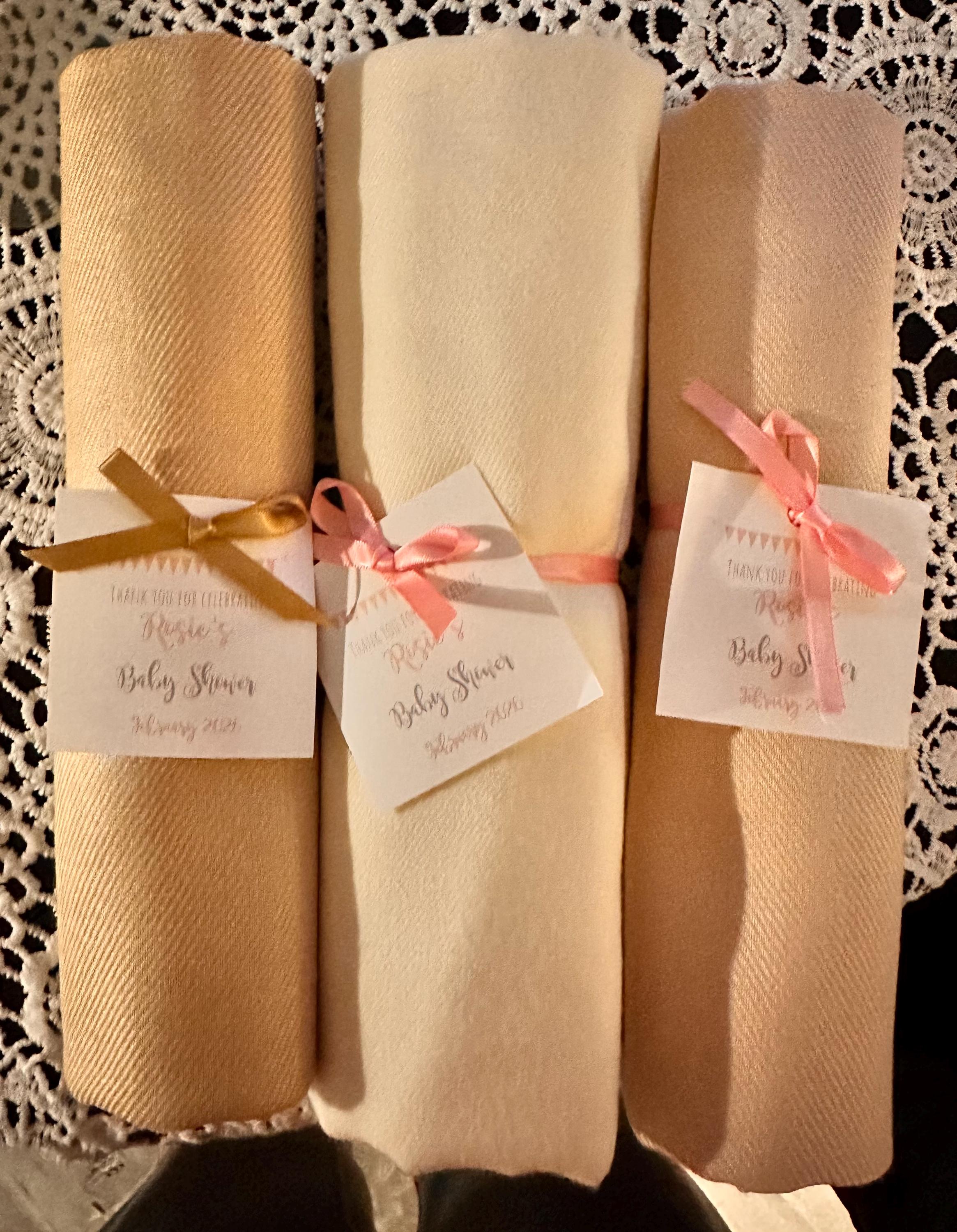 Customized pashminas made to order from a choice of 22 colors and 4 various options for tags; these shawls and wraps are perfect for wedding favors, bridesmaid gifts, and more!