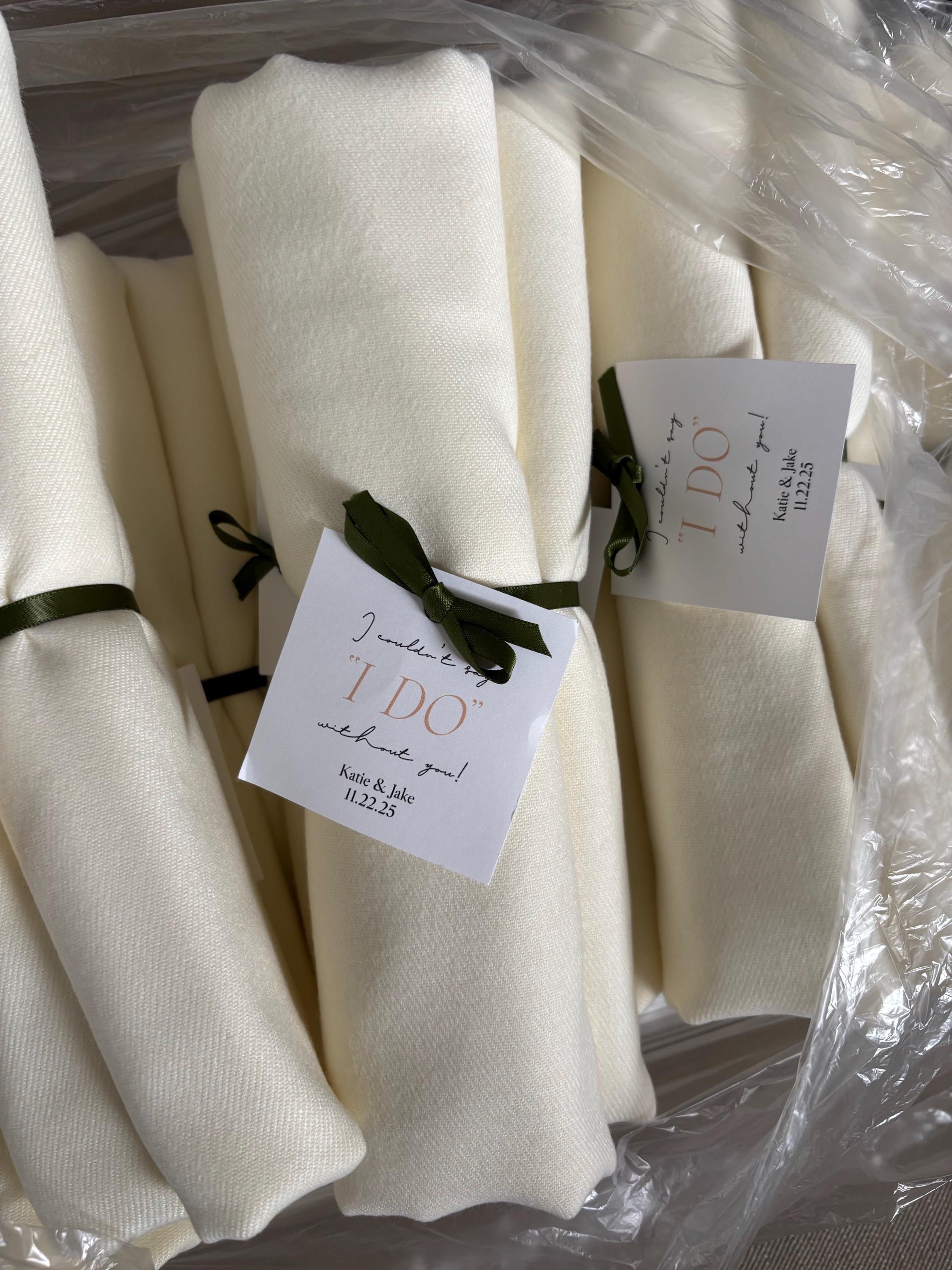 Customized pashminas made to order from a choice of 25 colors and 17 various options for tags; these shawls and wraps are perfect for wedding favors, bridesmaid gifts, and more!